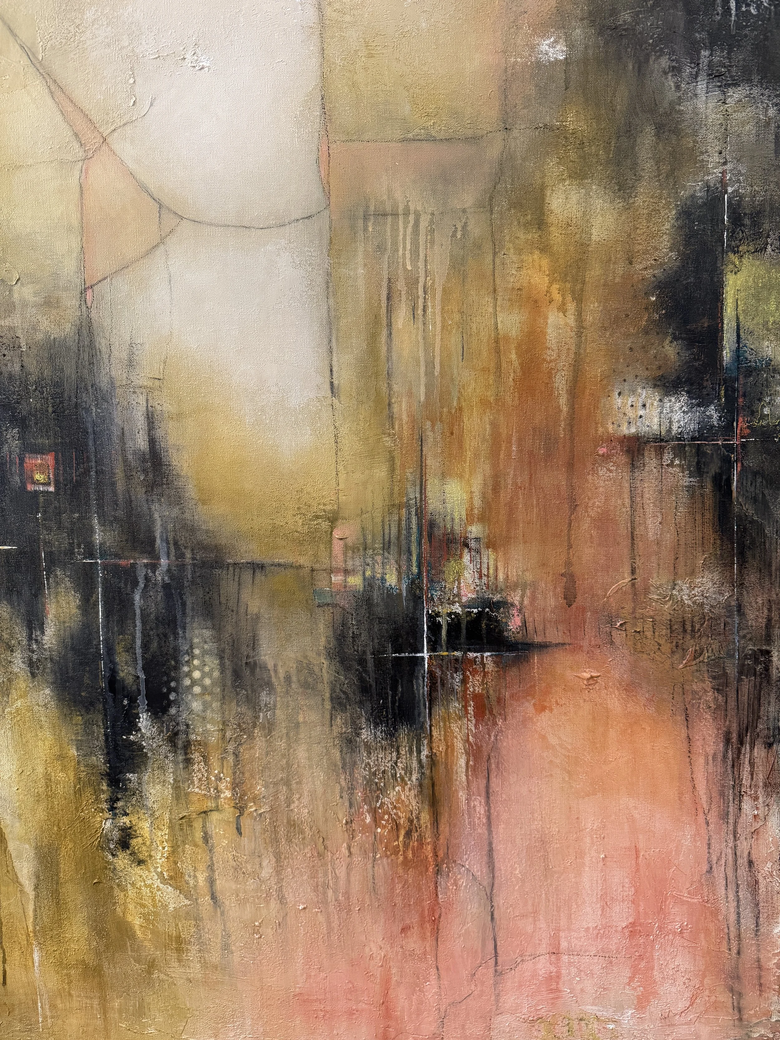 Abstract done in gold, grey, whites, and black. Lots of markings and interest. Fine acrylic paints on a 1.5 gallery wrapped canvas. Sealed with varnish and wired ready to hang.